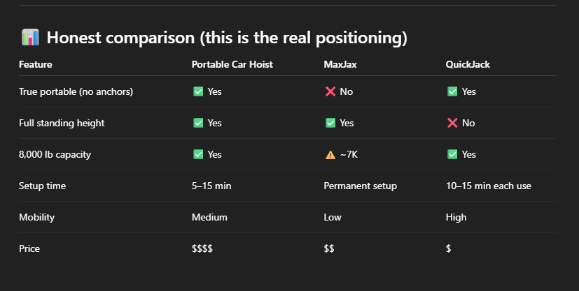 The Portable Car Hoist is the only category that combines full standing height, anchor-free installation, portability, and heavy-duty capacity (up to 76,000 lb) in one system.