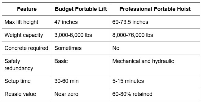 That last row matters more than people realize. A cheap portable lift is essentially a consumable. A well-built, American-made hoist holds its value and moves with your business.