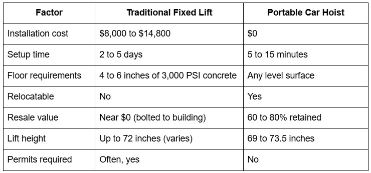 Traditional car lifts are anchored to the floor. They're permanent, which means they're strong but completely fixed. Want to rearrange your shop? Too bad. Moving buildings? You're leaving that lift behind. The installation alone, including concrete prep, electrical wiring, and permits, can run you between $8,000 and $14,800 on top of the lift itself.