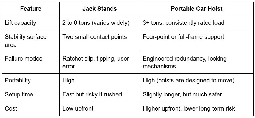 A portable car hoist distributes load more evenly, uses engineered locking systems rather than ratchet teeth, and is designed specifically for the kind of sustained static loads you create when you're working under a car for hours.